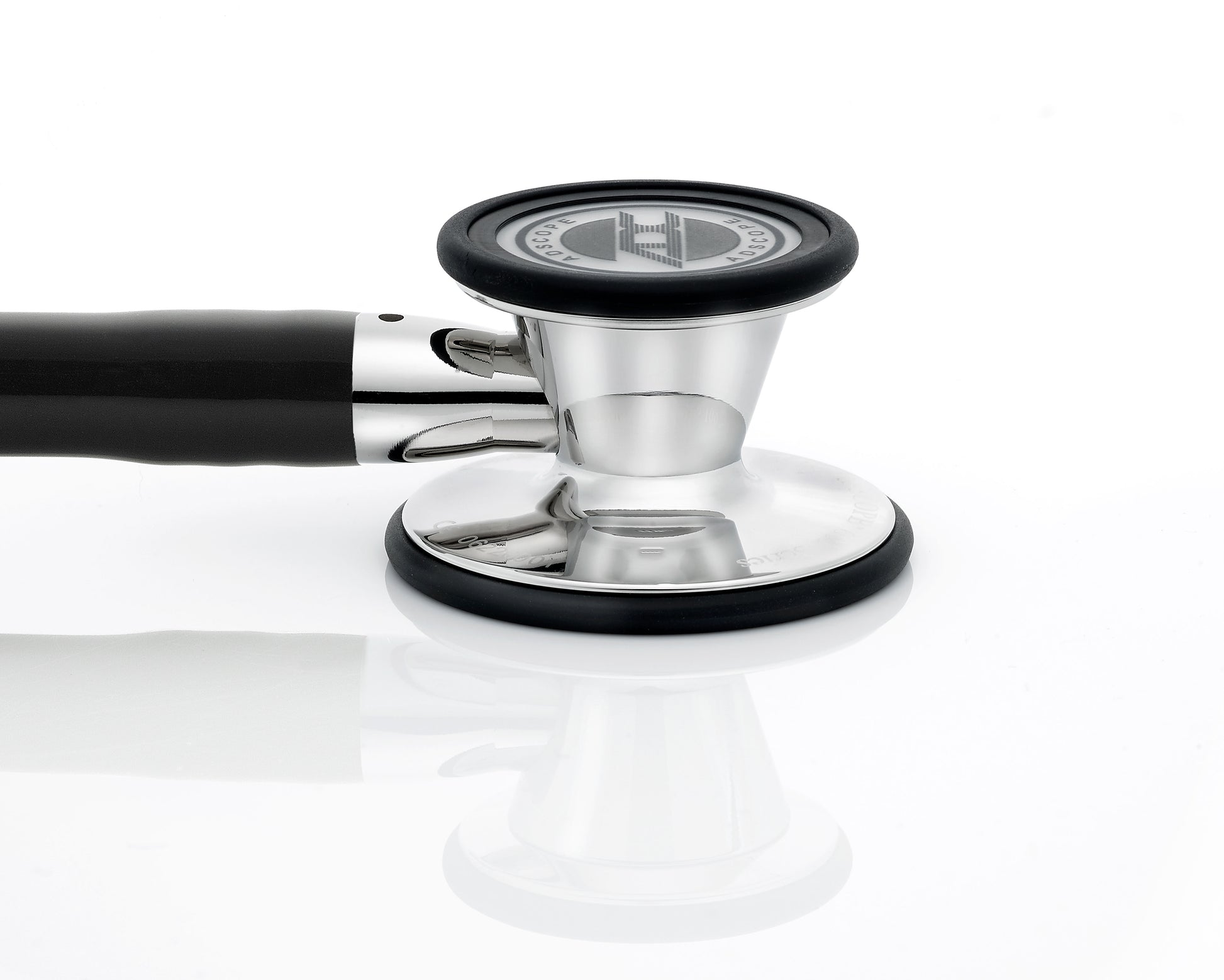 - Cardiology headset with large-bore stainless-steel binaurals fixed at 15° angle to maximize comfort and acoustic seal (tactical model with black anodized aluminum binaurals)
