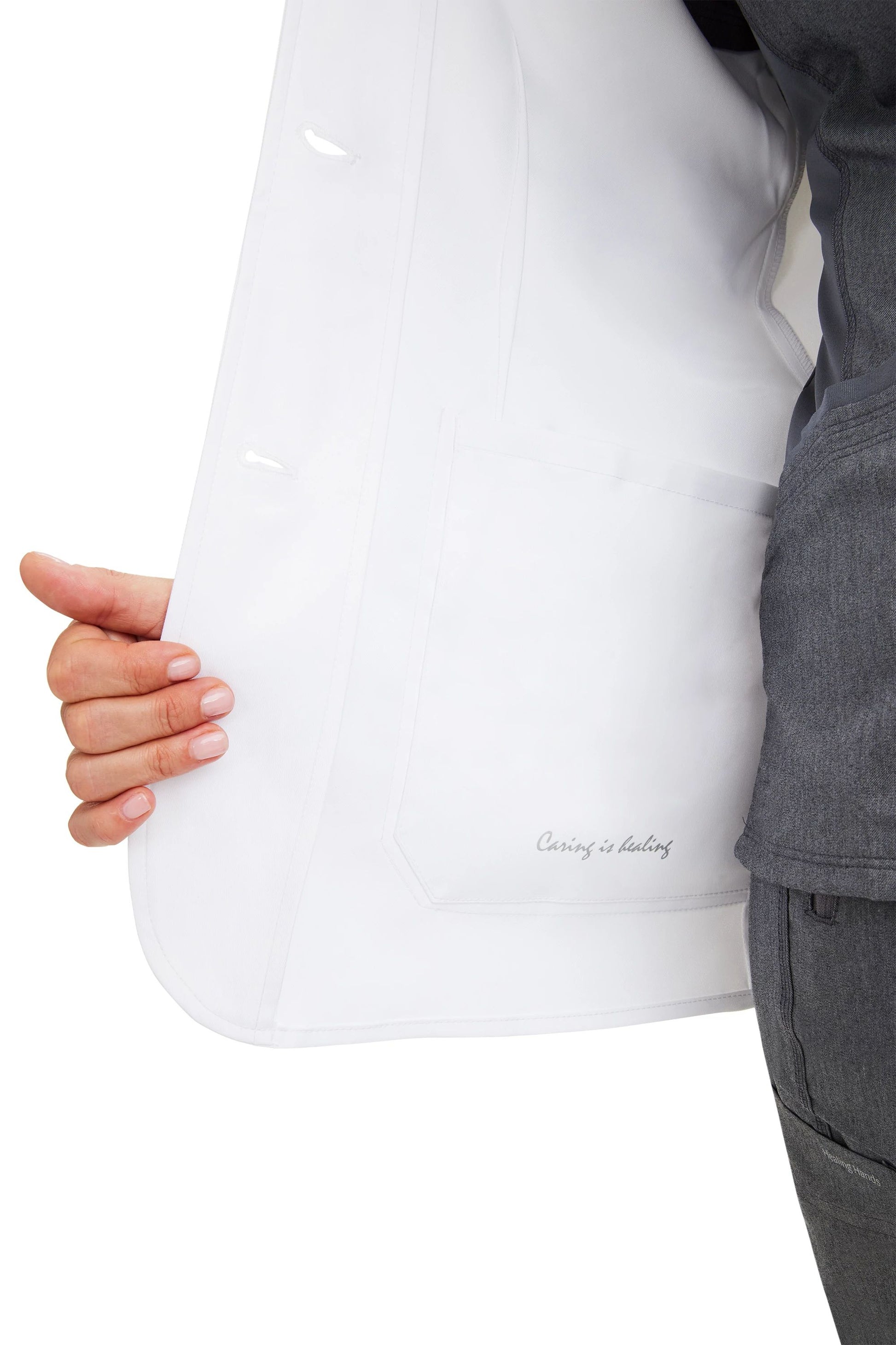 Experience the functional simplicity of the minimalist lab coats by Healing Hands Women’s Flo 30 ½” tall lab coat. This coat has all the bells and whistles you need, while maintaining a professional, clean look. It also includes a message from Healing Hand’s founder: Caring is healing.