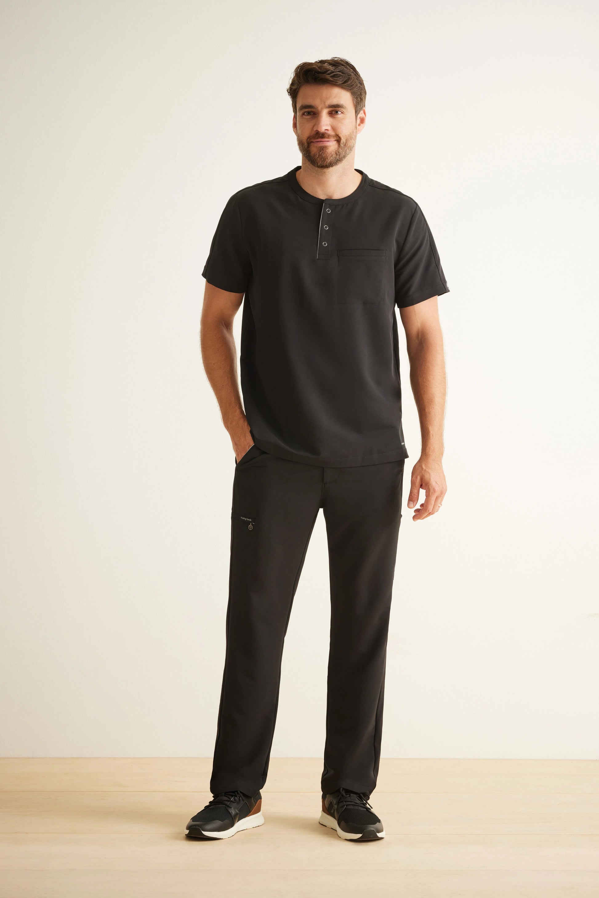 Men's Shane Top has a mandarin collar with snap-closure placket and one welt chest pocket. Reflective trim along placket. Racer-style sleeves feature dyed-to-match knit trim from collar to hem for mixed-media styling. Side vents for ease of movement. Top can be worn tucked or untucked. Modern Athletic fit.