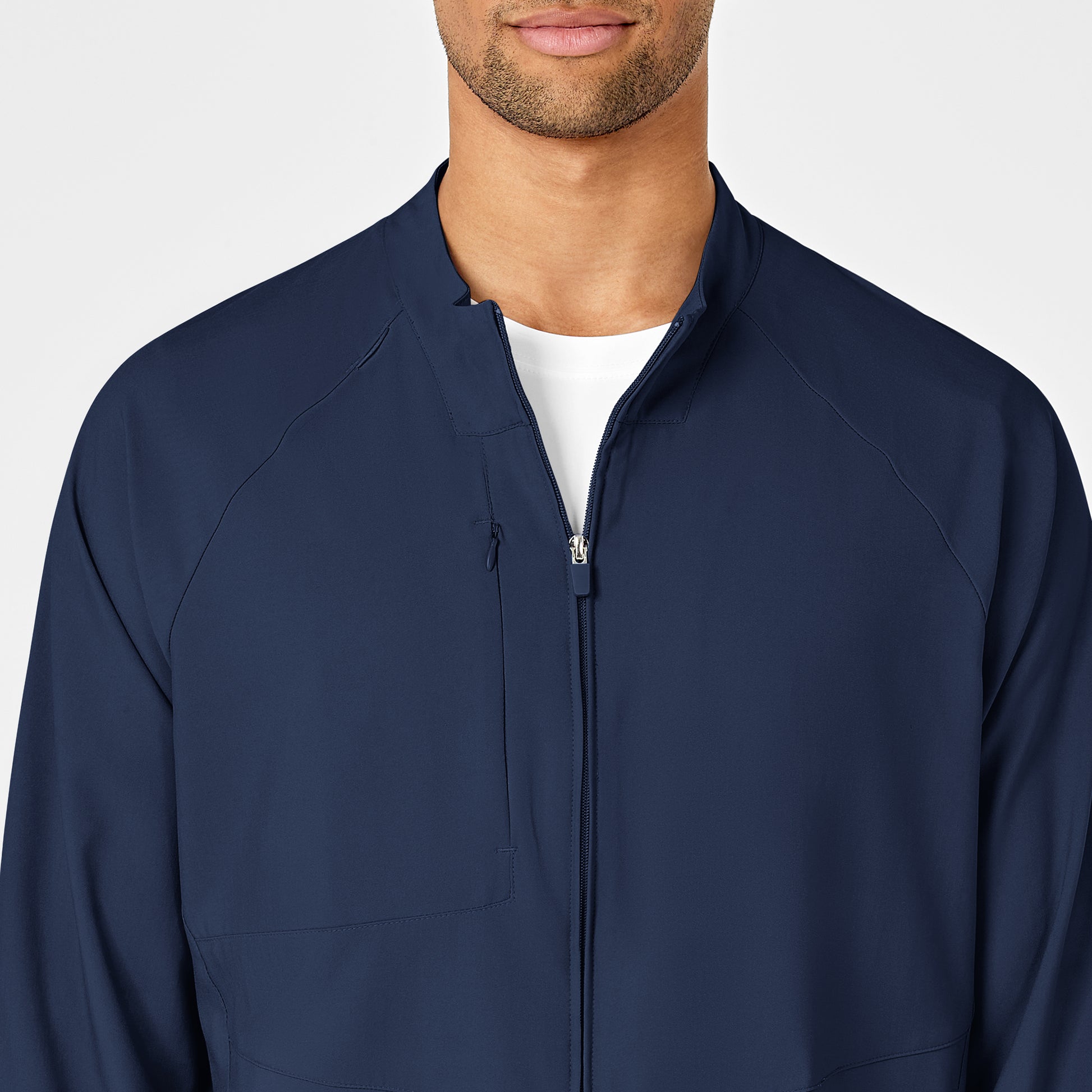 The Men's Scrub Jacket from Wink W123 collection is a lightweight essential fleece scrub jacket designed to work for you with features you love and trust, like the badge loop at the shoulder seem, the side entry pockets and a zip front closure this scrub jacket will work for you. The sleeve hems have a back elastic that helps them to stay-put when you slide them up. The chest pocket is large enough for a tablet and the back vents keep things comfortable around the waistline. All around it's a comfortable men's scrub jacket you'll want working for you.